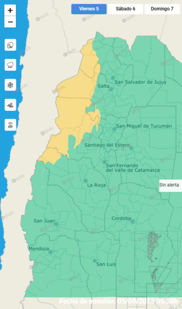 Por otro lado, el organismo nacional emitió otra alerta amarilla por vientos fuertes para este viernes, que afectará a cinco provincias argentinas.