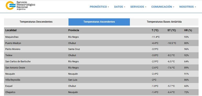 En las primeras horas del día ya se registraba una localidad patagónica como la más fría del país, se trata de Maquinchao en Río Negro registraba una temperatura de 11.4ºC bajo cero, seguida por Puerto Madryn, en Chubut con una sensación térmica de 10.5 ºC bajo cero y la localidad de Trelew en Chubut con 8.2 ºC bajo cero. Así lo indicó el ránking de del SMN.