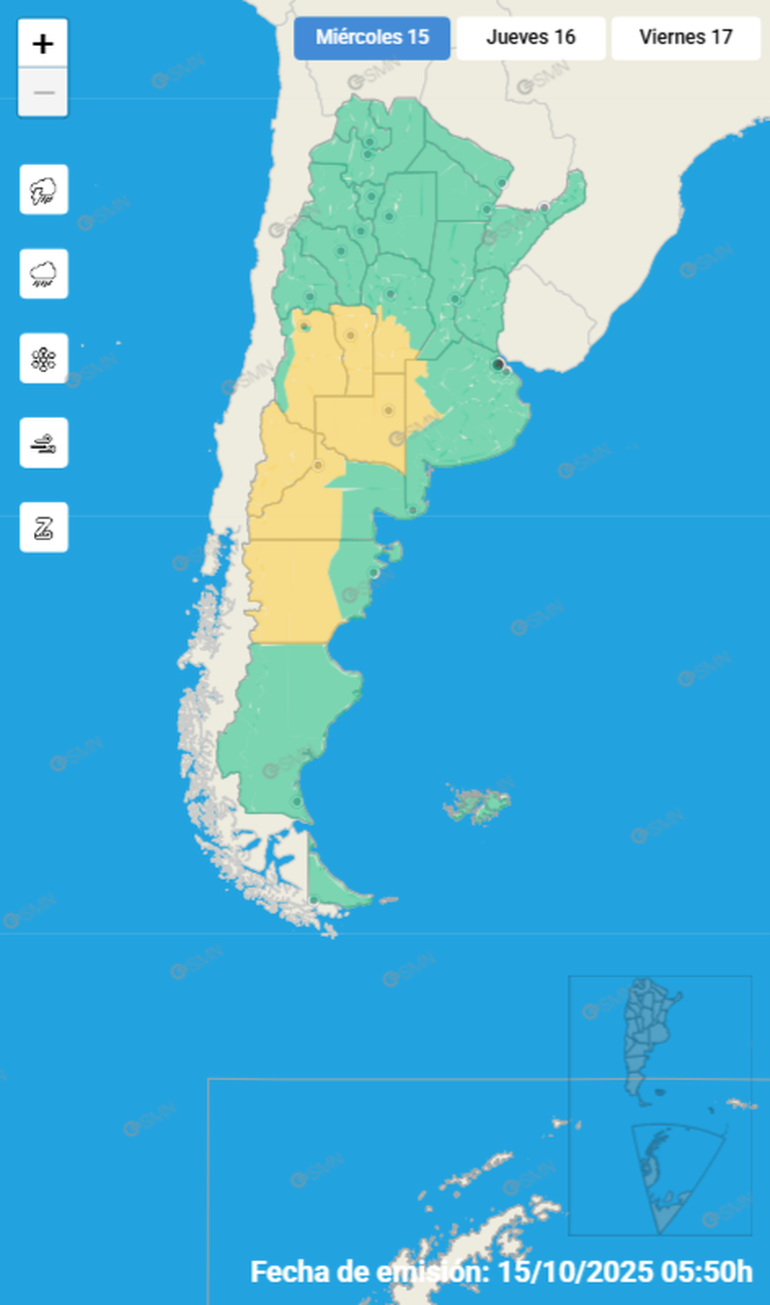 Según precisó el organismo, rige para este miércoles una alerta amarilla que afectará las provincias de Buenos Aires, Córdoba, La Pampa, San Luis, Mendoza, Neuquén, Río Negro y Chubut.