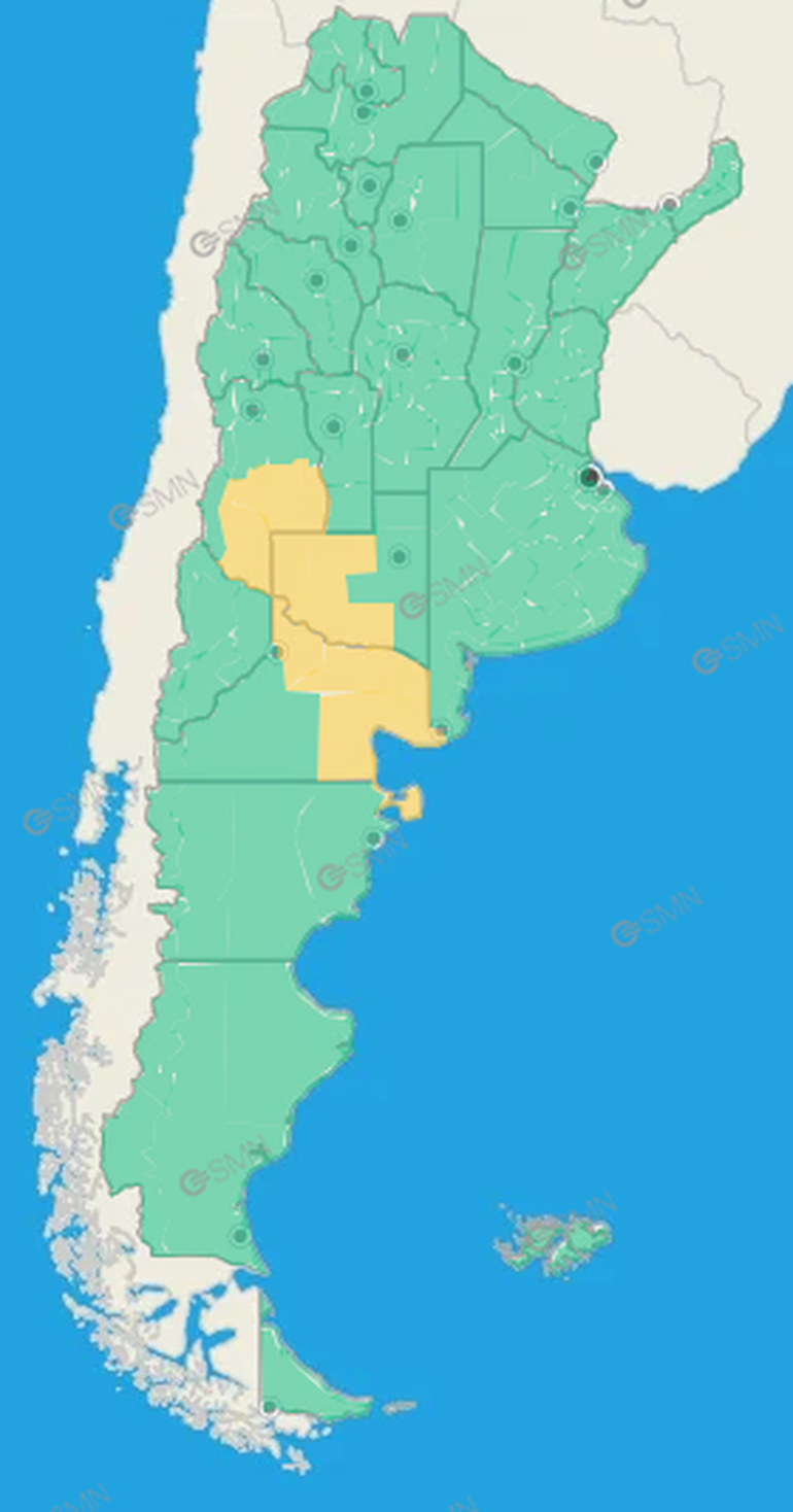 De acuerdo con el informe, la alerta amarilla por tormentas alcanza a sectores del centro del país, principalmente áreas de La Pampa, Mendoza, oeste de Río Negro y Chubut.