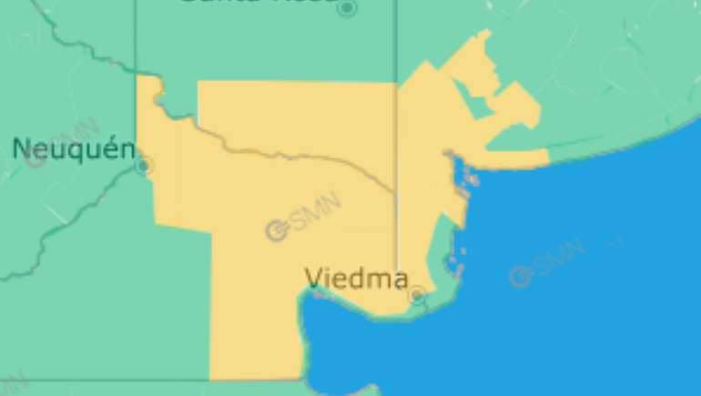El segundo bloque bajo alerta por tormentas es en el sur. Abarca el sur de La Pampa, el sur de provincia de Buenos Aires y la franja este de la provincia de Río Negro.
