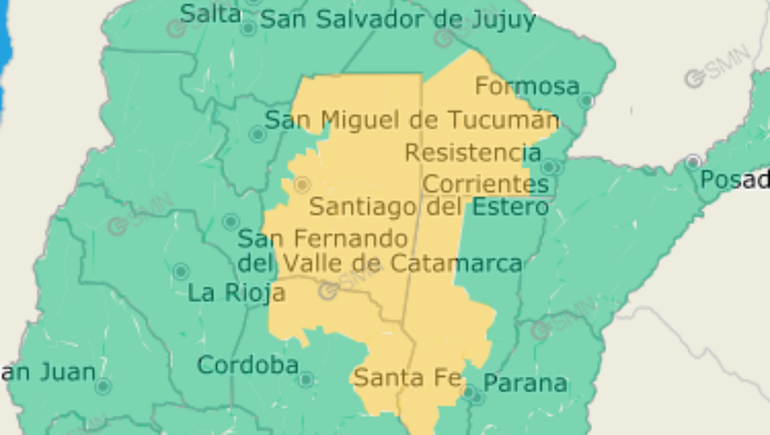 Los alertas están vigentes en dos bloques territoriales. Uno en el norte/noreste del país. Abarca casi la totalidad de Santiago del Estero, la mitad sur de Chaco, el oeste de Santa Fe y la franja norte de Córdoba.