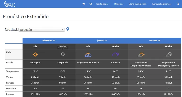 En tanto, en la ciudad de Neuquén, los pronósticos indican que vuelve el viento en la noche del jueves. De acuerdo a la Autoridad Interjurisdiccional de las Cuencas de los ríos Limay, Neuquén y Negro (AIC), las ráfagas máximas pronosticas pueden alcanzar los 60 kilómetros por hora; y los períodos de viento se mantienen hasta el sábado con un descenso de la temperatura. Aunque el día más ventoso será el viernes.