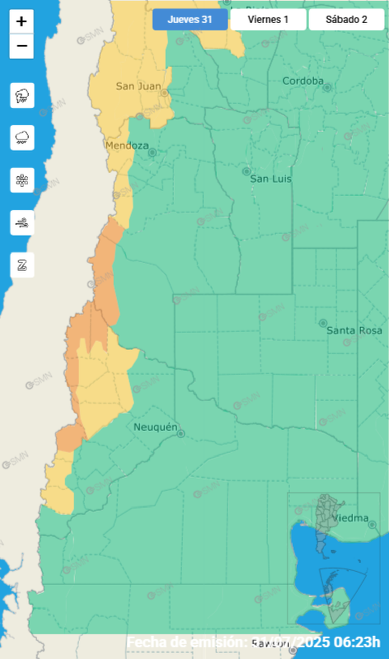 El Servicio Meteorológico Nacional (SMN) emitió una alerta amarilla por tormentas, vientos fuertes y nevadas para este jueves 31 de julio.