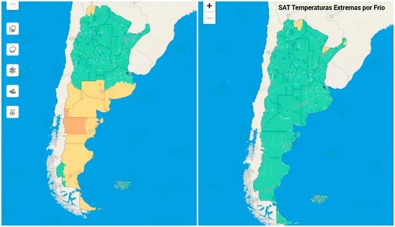 En paralelo, en el norte del país (Salta, Misiones y Corrientes) se emitió alerta amarilla por temperaturas extremadamente bajas.