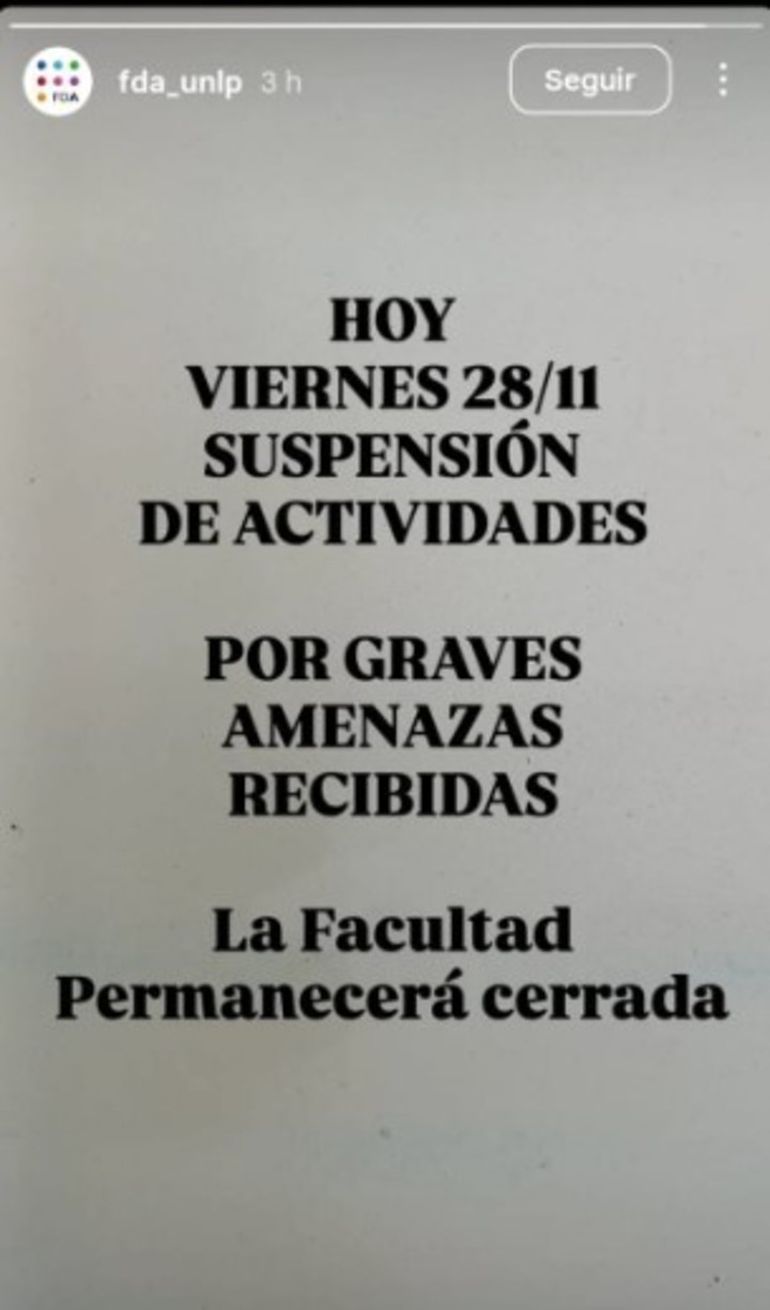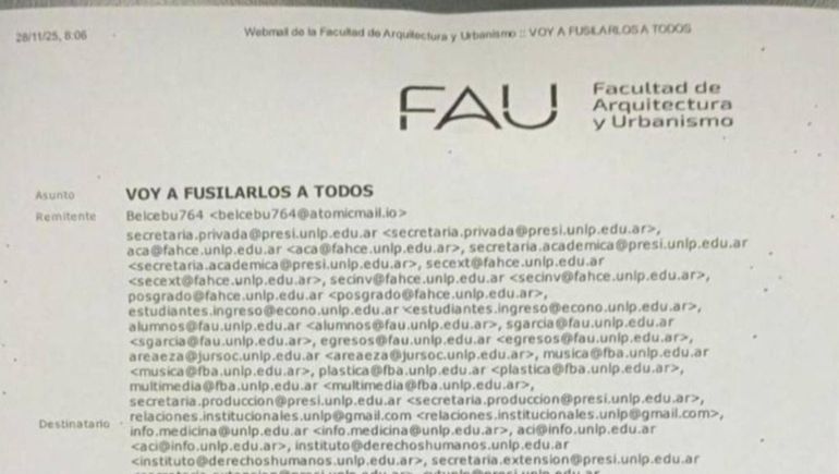 Este viernes, la Facultad de Artes de la Universidad Nacional de La Plata (UNLP) decidió suspender las clases luego de recibir una amenaza de “masacre a tiros” similar a las que suelen ocurrir en Estados Unidos, lo que generó alarma entre las autoridades.