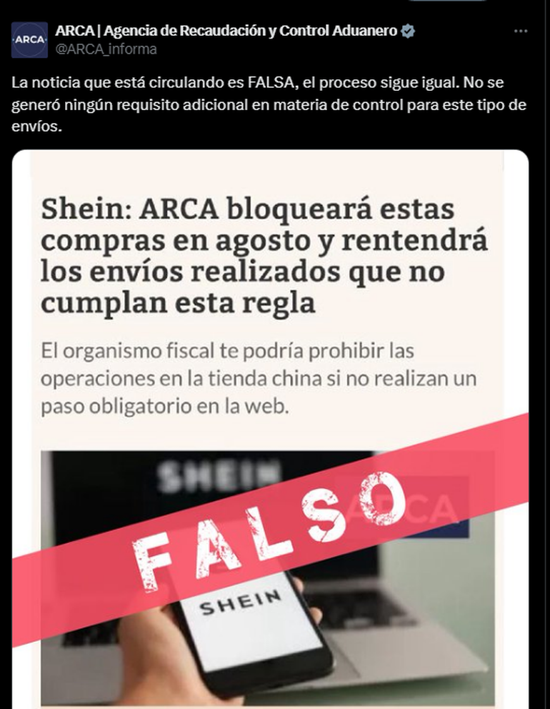 Ante el alcance que tuvo esta información, ARCA desmintió la noticia que la vincula con Shein, diciendo que el organismo bloquearía ciertas compras y retendría envíos que no cumplieran con ciertas condiciones.