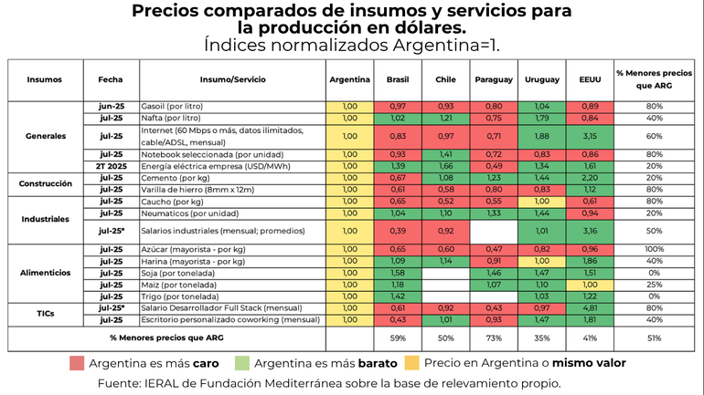 A partir de un relevamiento de 80 precios de 17 bienes y servicios claves para distintos sectores productivos, el estudio revela que en el 51% de los casos, los insumos en Argentina son más caros que en Paraguay, Brasil, Chile, Uruguay y Estados Unidos. El dato se vuelve aún más significativo si se tiene en cuenta que muchos de estos países compiten directamente con Argentina en los mismos mercados de exportación o en el abastecimiento del mercado interno.