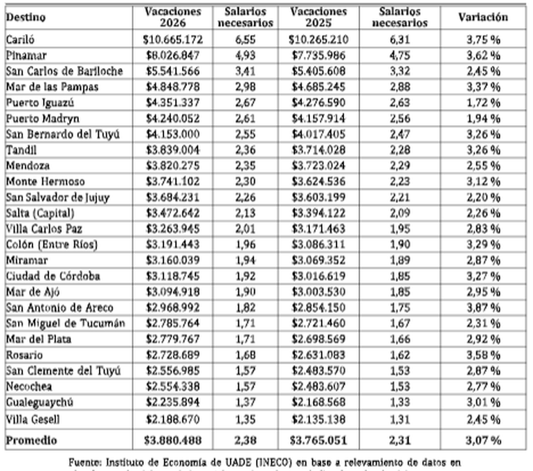 Una familia tipo necesitará casi 4 millones de pesos para irse de vacaciones en la segunda quincena del 2026 a algún destino de Argentina. Si en lugar de viajar dentro del país, su traslado fuera al exterior, el viaje requiere de un gastp de 10,3 millones de pesos. Así lo indica un estudio del Instituto de Economía de la Universidad Argentina de la Empresa (UADE).