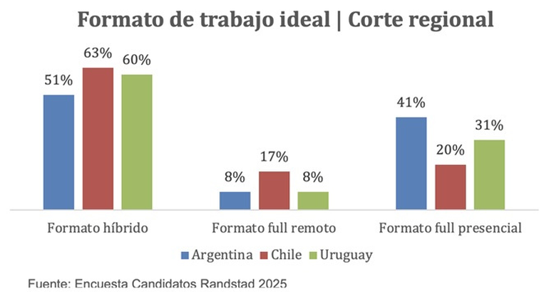 Sin embargo, en nuestro país la proporción de trabajadores que elegirían el formato presencial a tiempo completo (41 %) es bastante más alta que en Chile (20 %) y Uruguay (31 %).