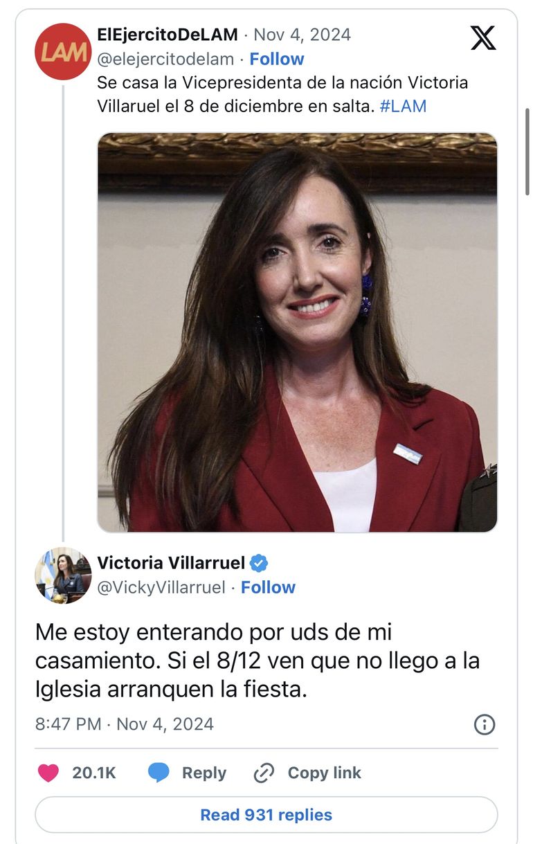 Minutos después, Victoria Villarruel usó su cuenta de X (ex Twitter) para desmentir a Yanina Latorre y aseguró que no se casa. “Me estoy enterando por ustedes de mi casamiento. Si el 8/12 ven que no llego a la Iglesia arranquen la fiesta”, escribió rápidamente en la publicación de LAM.
