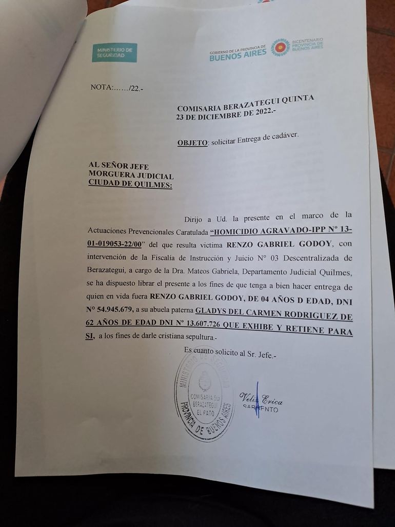 La víctima fatal fue identificada como Renzo Gabriel Godoy y el hecho, que trascendió en las últimas horas, es investigado por la la Unidad Funcional de Instrucción (UFI) número 3 de Quilmes, a cargo de Gabriela Mateos, que ordenó la inmediata detención de la madre del pequeño y su padrastro.