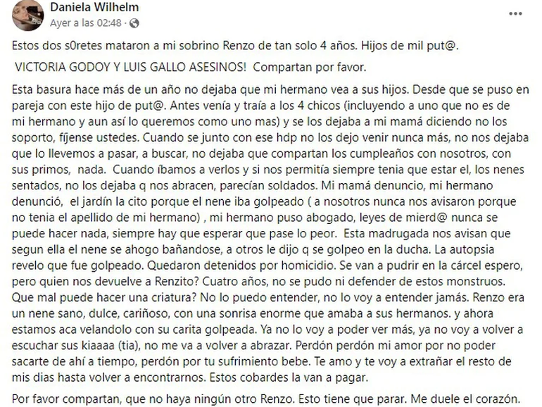 Luego, Daniela, continuó con su relato desgarrador: “Esta madrugada nos avisan que según ella el nene se ahogó bañándose, a otros le dijo que se golpeó en la ducha. La autopsia reveló que fue golpeado. Quedaron detenidos por homicidio. Se van a pudrir en la cárcel espero, pero quién nos devuelve a Renzito? Cuatro años, no se pudo ni defender de estos monstruos. ¿Qué mal puede hacer una criatura? No lo puedo entender, no lo voy a entender jamás. Renzo era un nene sano, dulce, cariñoso, con una sonrisa enorme que amaba a sus hermanos. y ahora estamos acá velándolo con su carita golpeada”.