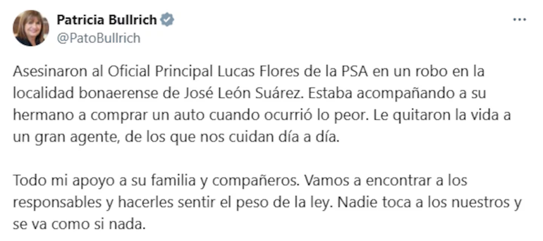La ministra de Seguridad de la Nación, Patricia Bullrich, se expresó mediante la red social X sobre el asesinato del Oficial, donde a su vez brindó apoyo a su familia y hará sentir "todo el peso de la ley" a los asesinos.