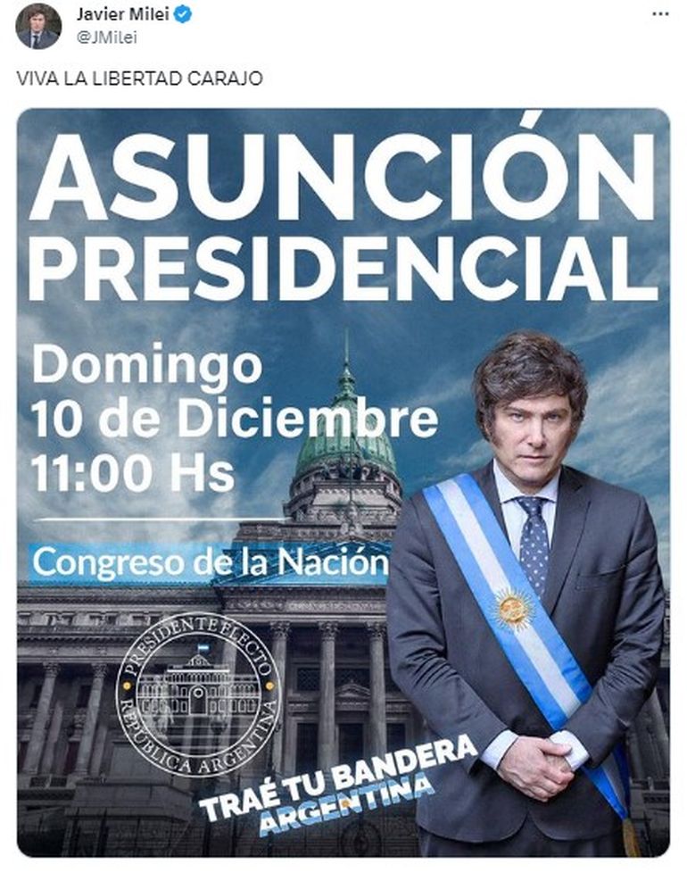 El presidente electo Javier Milei convocó a la ciudadanía a participar del acto de asunción a la presidencia que se celebrará el domingo desde las inmediaciones del Congreso. El libertario invitó a sus seguidores a acercarse al recinto en el marco de la Asamblea Legislativa, el domingo a las 11.