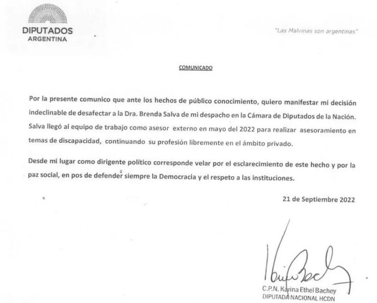 A su vez, Salva confirmó su trabajo como asesora de Bachey, además de haber realizado tareas periodísticas para “varios referentes del oficialismo”.