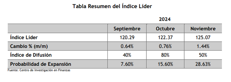 El Indice Líder registró el mes pasado un nivel de 125,07 puntos, lo que marcó una mejora de 1,44% con relación a octubre, pero con una caída de 5,44% respecto del número que había en el mismo mes del 2023.