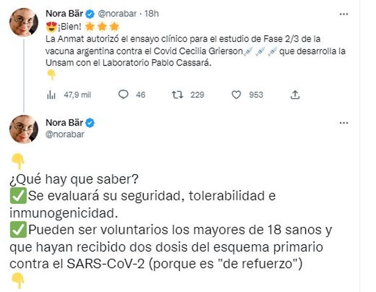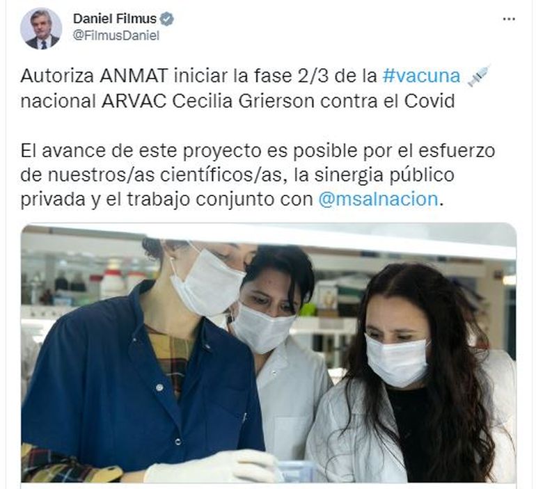 "El esfuerzo de nuestros científicos, la articulación entre distintos actores públicos y privados, y el trabajo conjunto con el Ministerio de Salud, que permite seguir adelante con este proyecto necesario para la salud de los argentinos y para la soberanía sanitaria", indicó.
