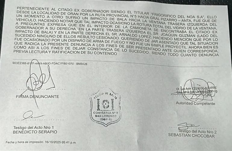 La denuncia que realizó el candidato de Fuerza Patria fue caratulada como "Daños", con intervención de la Fiscalía Penal de San Lorenzo, que ahora deberá determinar las circunstancias del ataque e identificar a los autores. García Bes precisó en el acta que el daño fue ocasionado por un disparo de arma de fuego y aclaró que "no se trató de un simple proyectil".