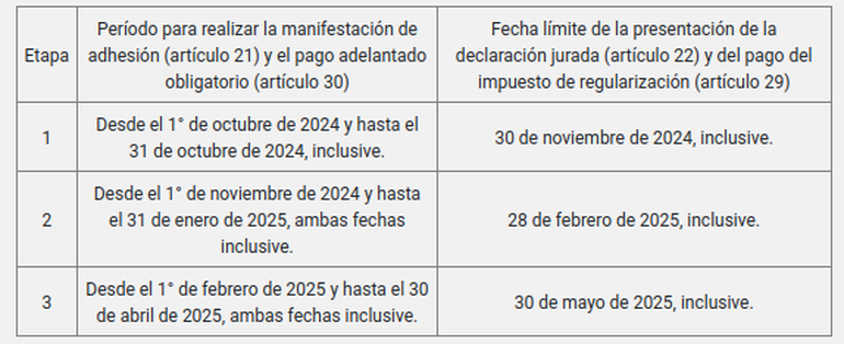 El plazo para depositar dinero en efectivo se ha extendido hasta el 31 de octubre de 2024. Originalmente, este vencía el 30 de septiembre de 2024. Los fondos deben depositarse en una Cuenta Especial de Regularización de Activos (CERA) en un banco o en una cuenta bancaria en el exterior si el dinero está fuera el país. A partir del 1 de noviembre de 2024, ya no será posible regularizar dinero en efectivo.