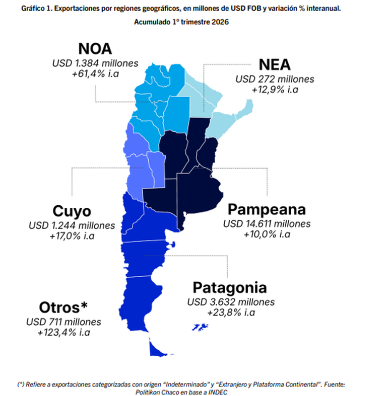 "Estas fueron las únicas provincias con exportaciones totales por encima de los mil millones de dólares y, en conjunto, concentraron el 75% del total de las exportaciones argentinas en el primer trimestre 2026", explicó Politikon Chaco.