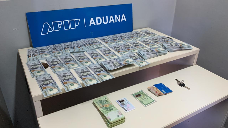 Agentes de la Dirección General de Aduanas apostados en el Paso Fronterizo Internacional Iguazú - Foz de Iguazú, descubrieron que una persona intentaba sacar 40.000 dólares y 42.000 pesos del país sin declarar, escondidos en sus medias.
