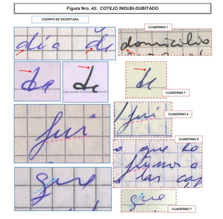 Con la firma de los peritos calígrafos Nelson Víctor Vallejos y Lilia Patricia Sendra Schamne, el peritaje solicitado por el Tribunal Oral Federal 7 sostiene que "existe correspondencia entre los cuadernos originales identificados como 1, 2, 4, 6, 7 y 8, y sus respectivas copias digitales". También advirtieron que falta el original del cuaderno 5.