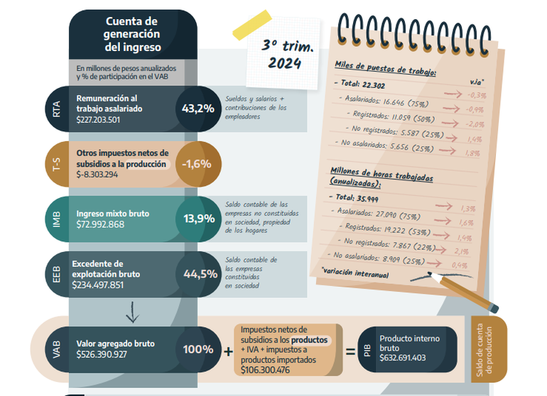 De acuerdo con datos del Instituto Nacional de Estadística y Censos (INDEC) el Producto Bruto Interno (PBI) de la Argentina alcanzó en el tercer trimestre del 2024 a los $632.69 billones. La participación del salario fue del 43,2% con una caída del 1,74% respecto de igual período de 2023.
