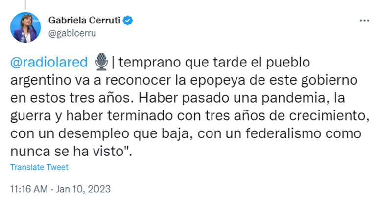 "Más temprano que tarde, espero que más temprano, el pueblo argentino va a reconocer la epopeya que realizó este Gobierno durante estos años. Se pasó una pandemia, una guerra y hubo tres años de crecimiento, con un desempleo a la baja y una gestión con federalismo", indicó Cerruti.