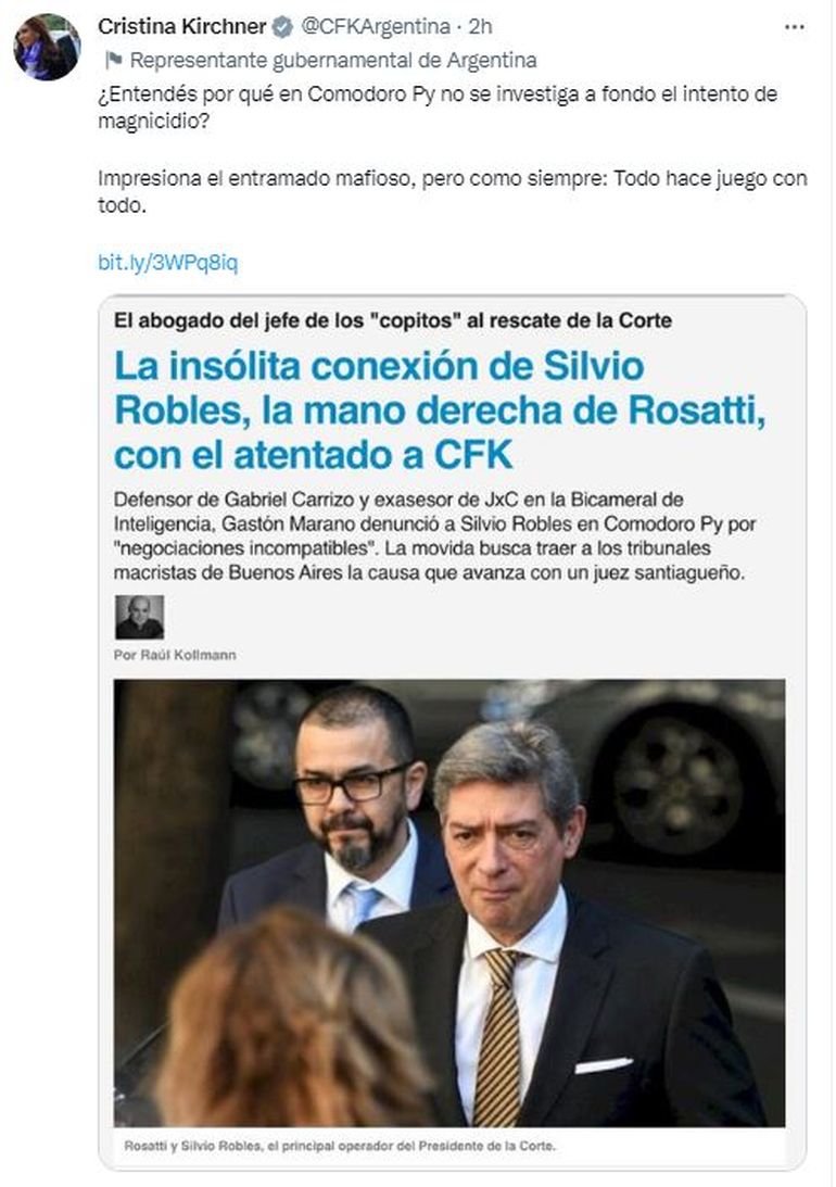 La vicepresidenta Cristina Fernández de Kirchner volvió a denunciar este jueves la resistencia de los tribunales de Comodoro Py a investigar el intento de magnicidio en su contra, en un mensaje por Twitter al que adjuntó una nota de Página 12 publicada bajo el título "La insólita conexión de Silvio Robles, la mano derecha de Rosatti, con el atentado a CFK".