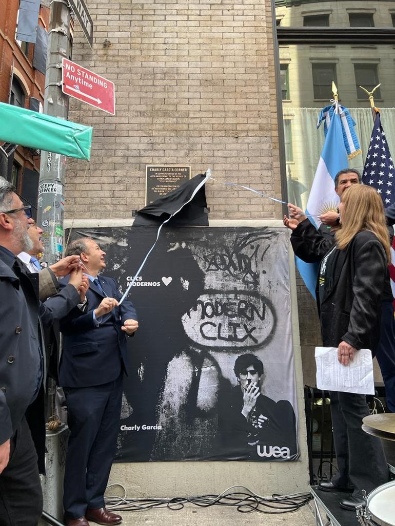 Para finalizar la actividad, se develó una placa recordatoria en la pared donde Charly se tomó la foto de tapa, y el característico cartel verde de las calles de Nueva York con el nombre de “Charly García Corner”.