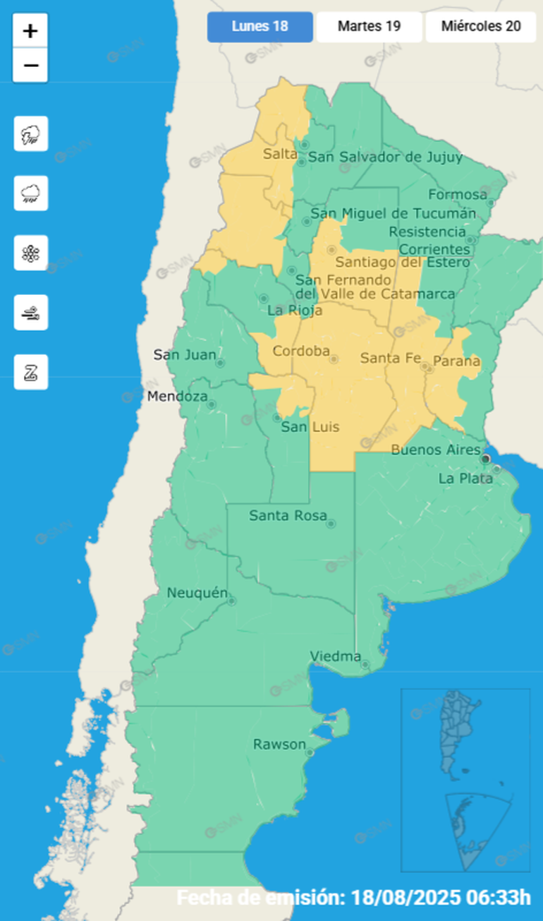 Este lunes, las provincias más comprometidas por tormentas y lluvias son Buenos Aires, Córdoba, Santa Fe, Entre Ríos y Corrientes, con niveles de advertencia en amarillo, lo que implica la posibilidad de fenómenos meteorológicos con capacidad de causar inconvenientes. Para el martes, la zona de riesgo se amplía hacia el norte, abarcando también Formosa y Misiones, mientras que en el resto del país las condiciones se mantendrán más estables.