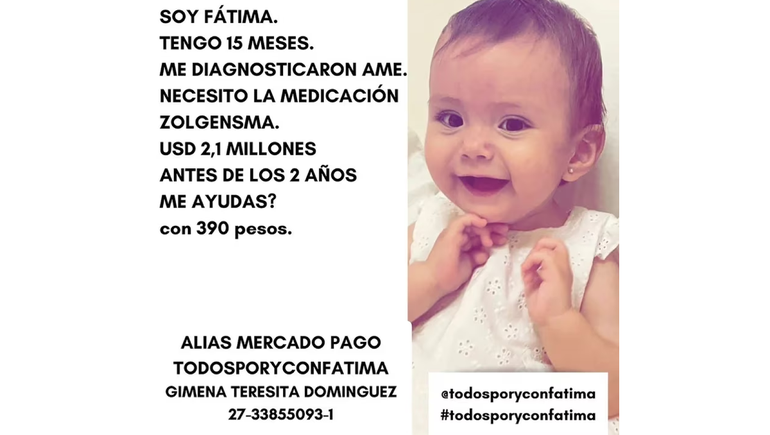 A través de su cuenta de Instagram @todosporyconfatima, buscan reunir un total de 2,1 millones de dólares para costear el medicamento Onasemnogén Abeparvovec (conocido comercialmente como Zolgensma). Se trata del fármaco de mayor valor en toda la región y el segundo más caro a nivel mundial, el cual debe ser aplicado antes de que la beba cumpla los dos años.