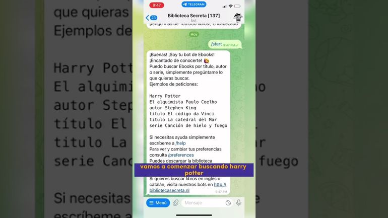 En Telegram, la búsqueda de “Biblioteca secreta” despliega una serie de chats, cada uno numerado y etiquetado como ‘bot‘. Un ejemplo es “Biblioteca Secreta (2024)”. Al interactuar con uno de ellos, el bot se presenta como una herramienta para descargar libros gratis en formato PDF.