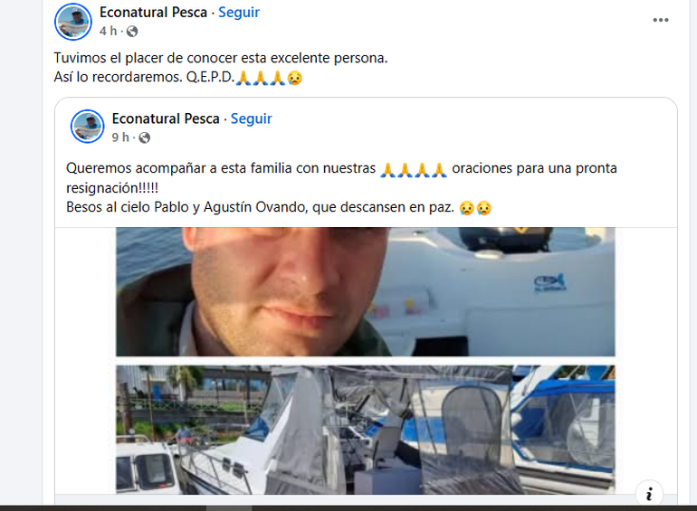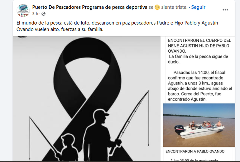 "El mundo de la pesca está de luto, descansen en paz pescadores padre e hijo. Pablo y Agustín Ovando vuelen alto, fuerzas a su familia", escribieron desde la página de Puerto de Pescadores Programa de pesca deportiva de esa ciudad.
