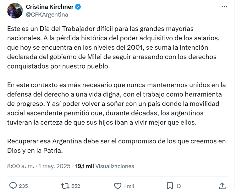 La exvicepresidenta realizó un posteo este jueves por la mañana con motivo del 1° de mayo. Consideró que se da "una pérdida histórica del poder adquisitivo".