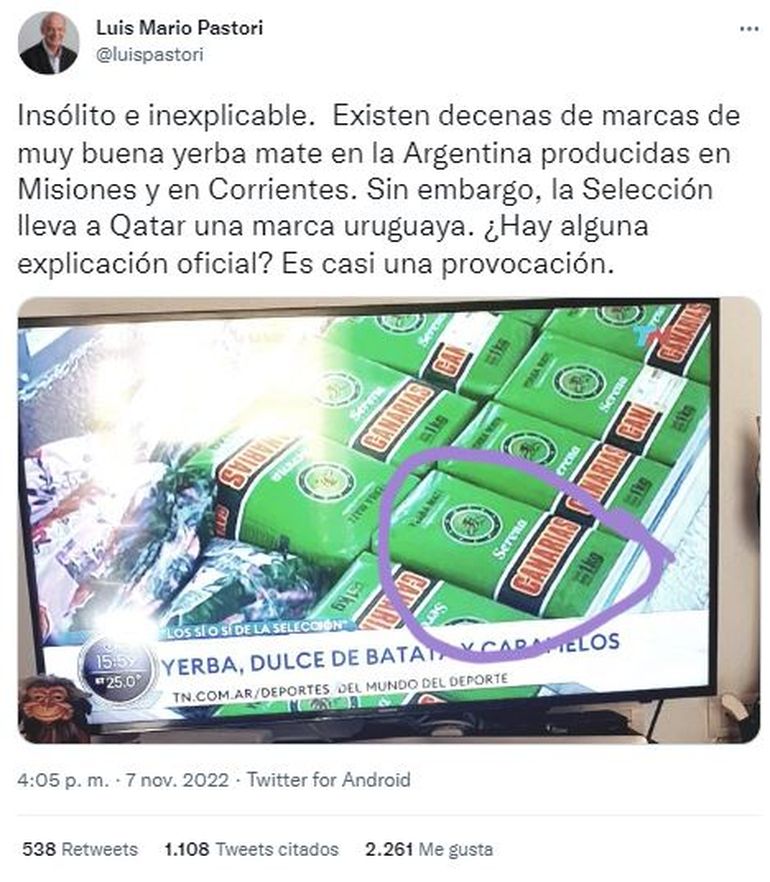 Pastori, quien fue legislador misionero por la UCR, mostró su indignación en Twitter: “Insólito e inexplicable. Existen decenas de marcas de muy buena yerba mate en la Argentina producidas en Misiones y en Corrientes. Sin embargo, la Selección lleva a Qatar una marca uruguaya”, escribió.