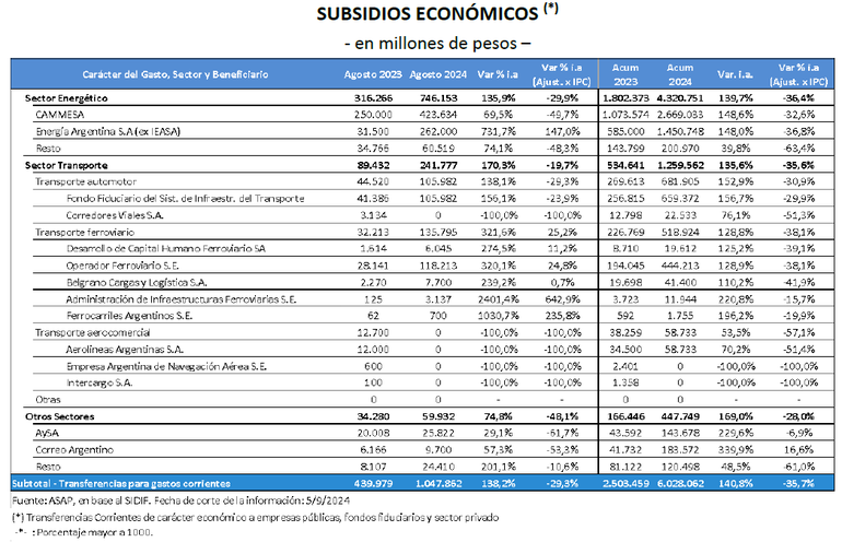 De acuerdo con el análisis de la Asociación Argentina de Presupuesto y Administración Financiera Pública (ASAP), la continuidad de la caída en los subsidios que hubo en agosto en todos los sectores se explica “por la dinámica de los dos principales, tanto Energía como Transporte, que registraron caídas interanuales de 29,9% y 19,7% ajustados por inflación, respectivamente”.