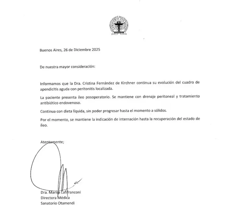 “Informamos que la Dra. Cristina Fernández de Kirchner continua su evolución del cuadro de apendicitis aguda con peritonitis localizada. La paciente presenta íleo posoperatorio. Se mantiene con drenaje peritoneal y tratamiento antibiótico endovenoso”, detallaron en el parte.