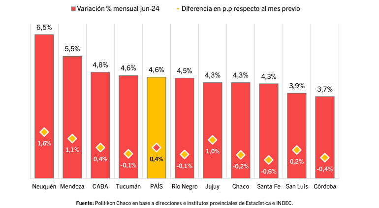 Los cinco distritos que registraron aceleraciones, en línea con lo observado en el nivel nacional, fueron Neuquén (+1,6 p.p.), Mendoza (+1,1 p.p.), Jujuy (+1,0 p.p.), CABA (+0,4 p.p.) y San Luis (+0,2 p.p.); por su parte, otras cinco provincias registraron desaceleraciones en la tasa de crecimiento del IPC: Tucumán (-0,1 p.p.), Río Negro (-0,1 p.p.), Chaco (-0,2 p.p.), Córdoba (-0,4 p.p.) y Santa Fe (-0,6 p.p.).