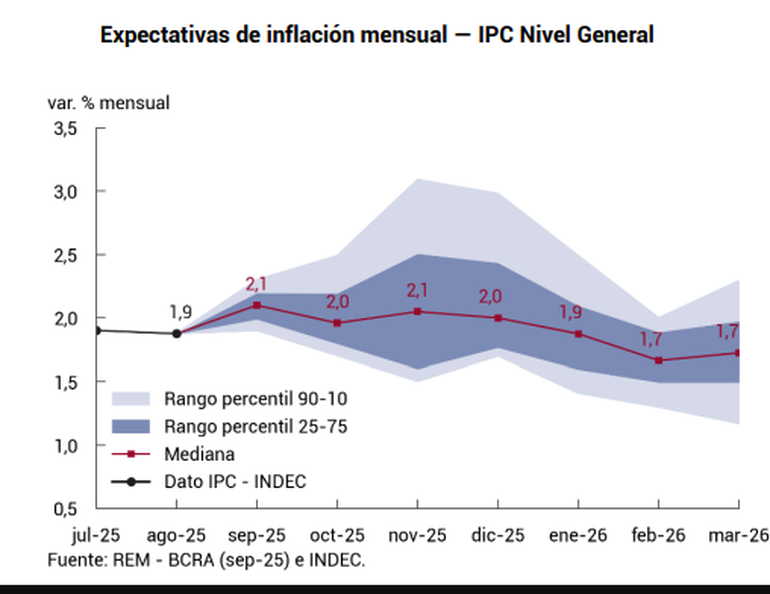 “Para los últimos meses de 2025 se proyecta una inflación nivel general en torno del 2% mensual, al tiempo que volvería a ubicarse por debajo del 2% mensual a partir de enero de 2026”, indicó el BCRA.