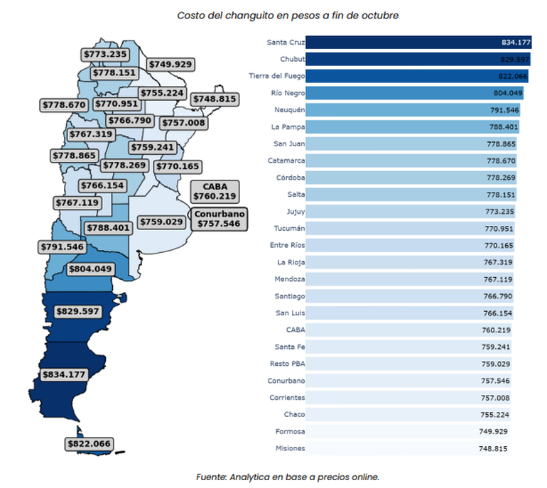 El changuito más costoso se encuentra en Santa Cruz ($834.177), seguido por otras provincias patagónicas como Chubut ($829.597), Tierra del Fuego ($822.066), Río Negro ($804.049) y Neuquén ($791.546). Las provincias con la compra más económica son Chaco ($755.224), Formosa ($749.929) y Misiones ($748.815)
