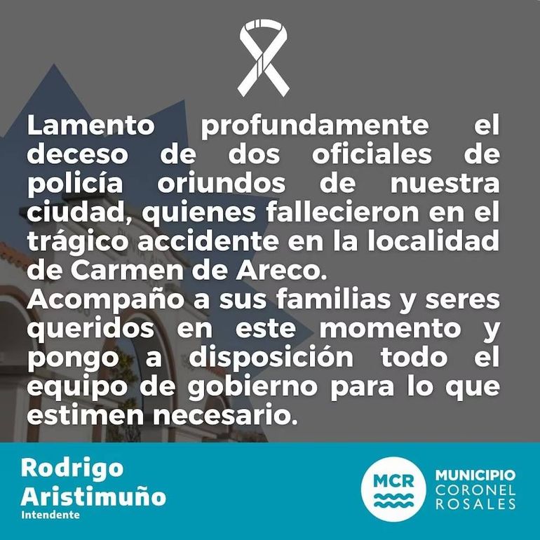 Rodrigo Aristimuño, intendente de Coronel Rosales, partido al que pertenece Punta Alta, escribió en sus cuentas oficiales tras enterarse la triste noticia: “Lamento profundamente el deceso de dos oficiales de policía oriundos de nuestra ciudad, quienes fallecieron en el trágico accidente en la localidad de Carmen de Areco. Acompaño a sus familias y seres queridos en este momento y pongo a disposición todo el equipo de gobierno para lo que estimen necesario”.