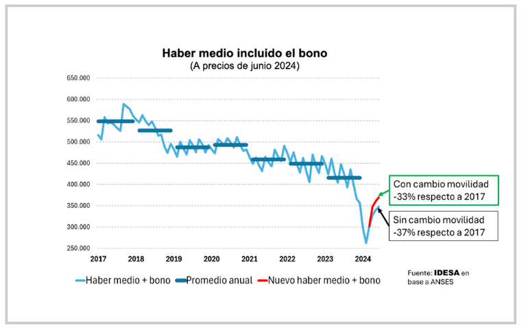 - En junio 2024 el haber medio, incluyendo el bono que no está sujeto a la movilidad, se ubica aproximadamente un 37% por debajo del nivel registrado en el 2017.