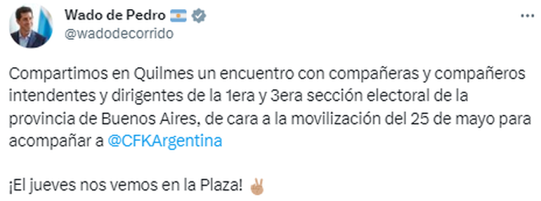 El ministro del Interior, Eduardo "Wado" De Pedro, se reunió este lunes con el diputado nacional Máximo Kirchner e intendentes bonaerenses de la 1ra y la 3ra sección electoral en la previa al acto del 25 de mayo que encabezará la vicepresidenta Cristina Kirchner.