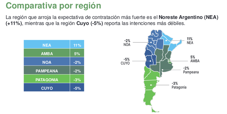 La región de Cuyo y la Patagonia arrojan las expectativas de contratación más débiles, con una ENE de -5% y -3% respectivamente.