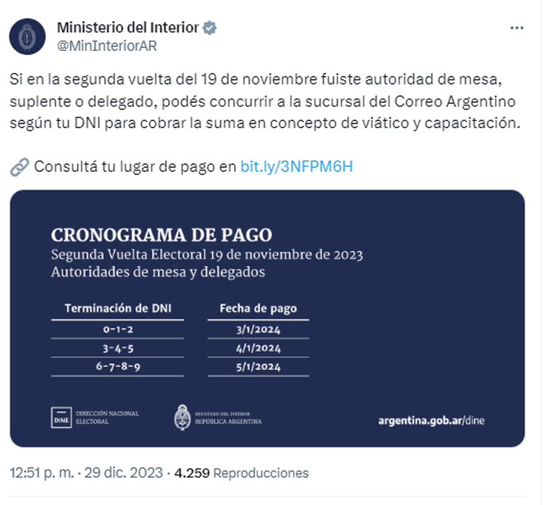 "Si en la segunda vuelta del 19 de noviembre fuiste autoridad de mesa, suplente o delegado, podés concurrir a la sucursal del Correo Argentino según tu DNI para cobrar la suma en concepto de viático y capacitación", informaron a través de la cuenta de X (ex Twitter).