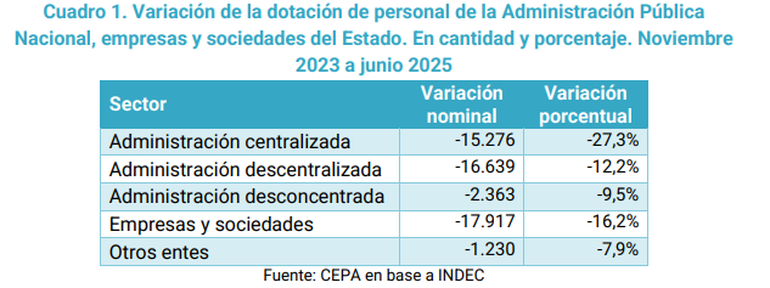 El CEPA señala que “en ese marco, el Gobierno sostiene la necesidad de reducir el tamaño del Estado y, fundamentalmente, ajustar a sus trabajadores” y advierte que “se observa un recorte persistente en el empleo público nacional durante todos los meses de la gestión libertaria”.