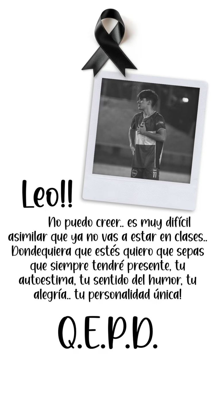 “¡Leo! No puedo creer, es muy difícil asimilar que ya no vas a estar en clases. Dondequiera que estés quiero que sepas que siempre tendré presente tu autoestima, tu sentido del humor, tu alegría y tu personalidad única. QEPD”, publicó en su Instagram personal la docente Evelin Urunaga.
