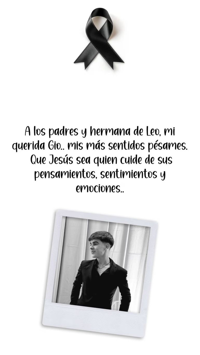 En ese contexto, escribió un conmovedor posteo: “A los padres y hermana de Leo, mi querida Gio, mis más sentidos pésames. Que Jesús sea quien cuide de sus pensamientos, sentimientos y emociones”.